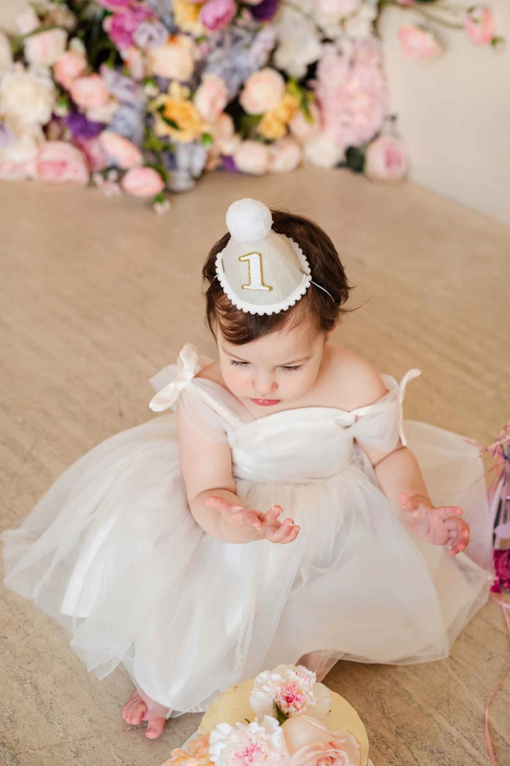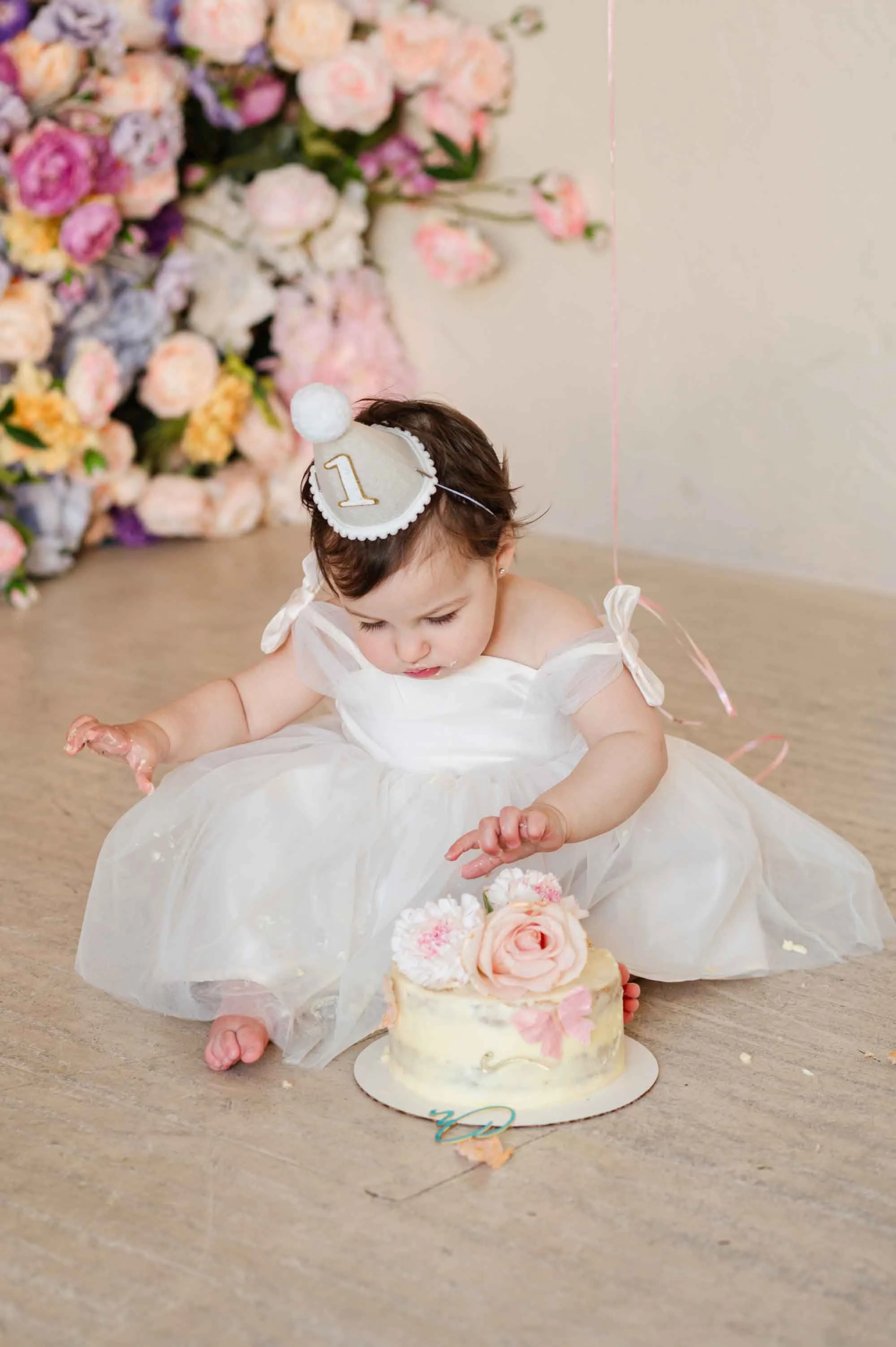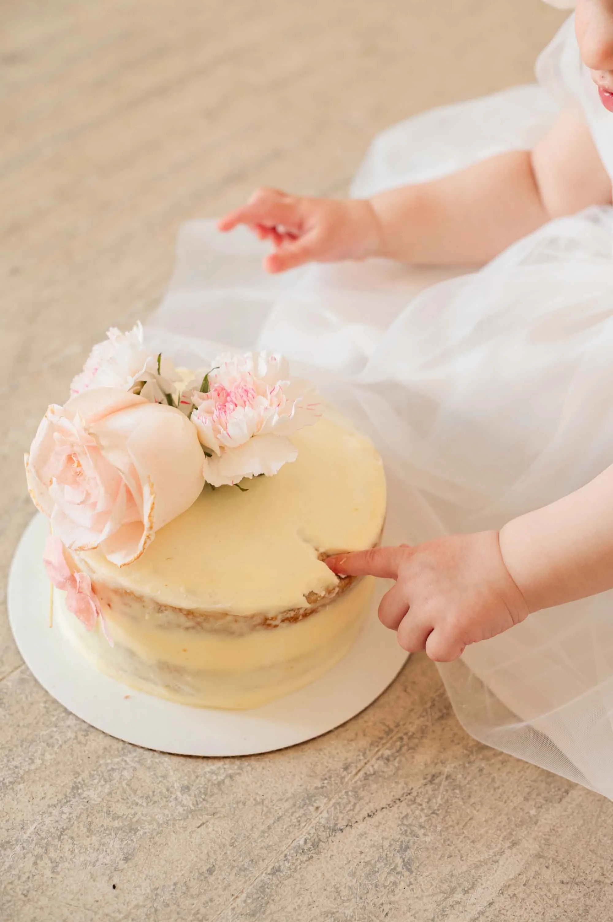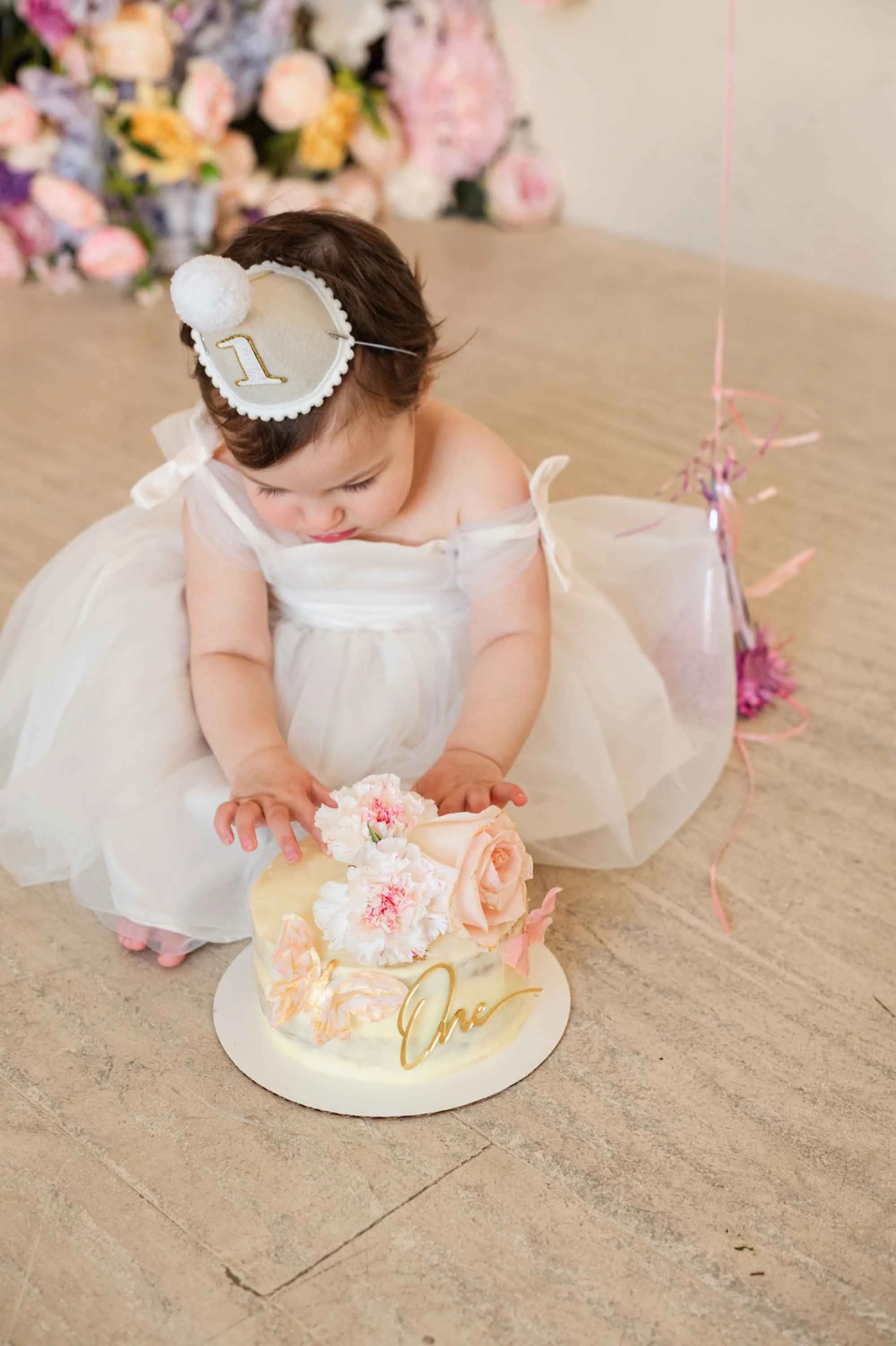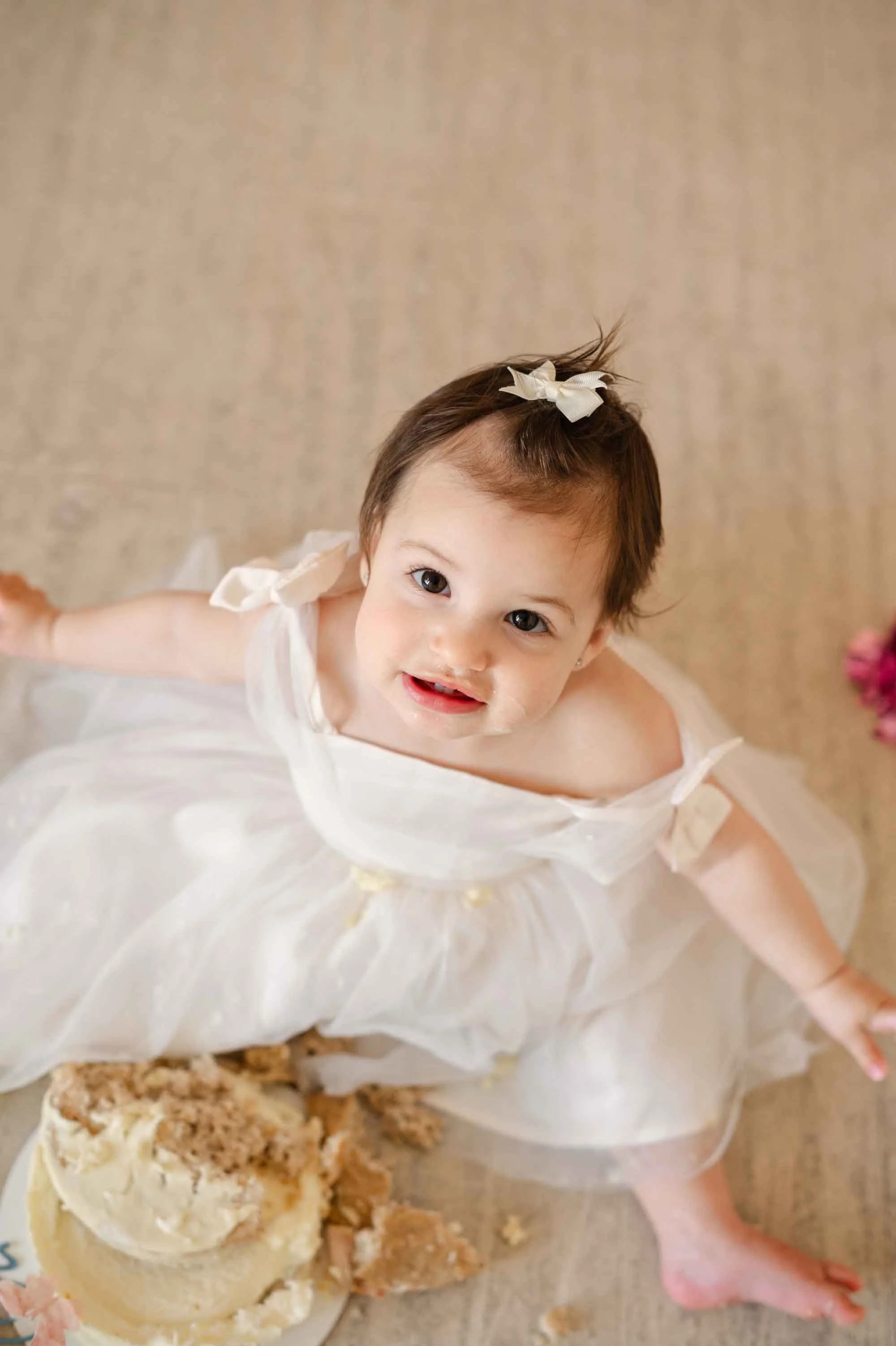 Then came the main event: the Cake Smash. As soon as the pastel cake was placed in front of her, her face lit up in the most adorable way. From delicate pokes to full, enthusiastic handfuls, she explored every bit of frosting with pure delight. Sticky fingers, sweet smiles, and endless giggles—it was the perfect combination of chaos and cuteness that makes first birthday sessions so memorable.