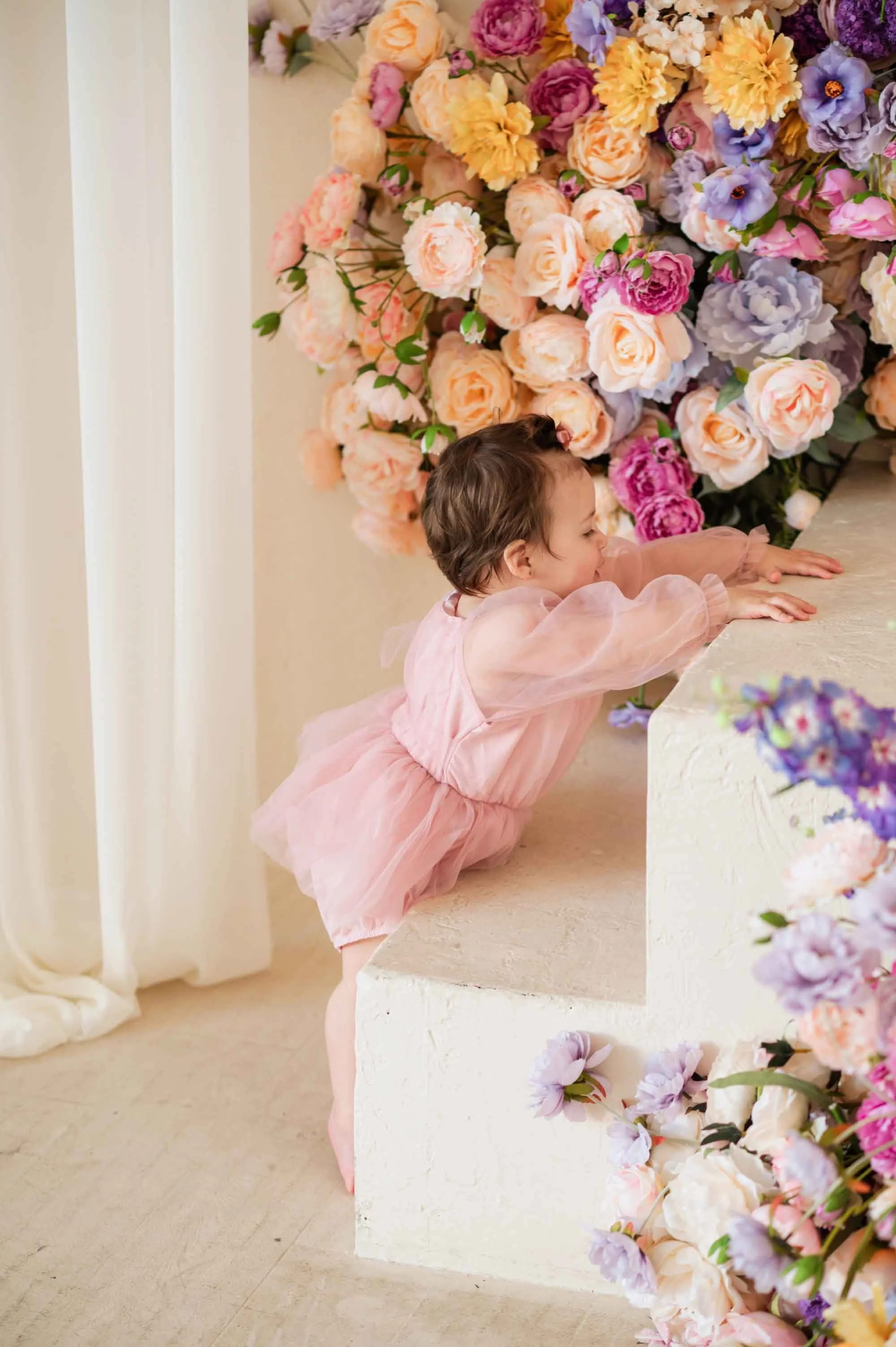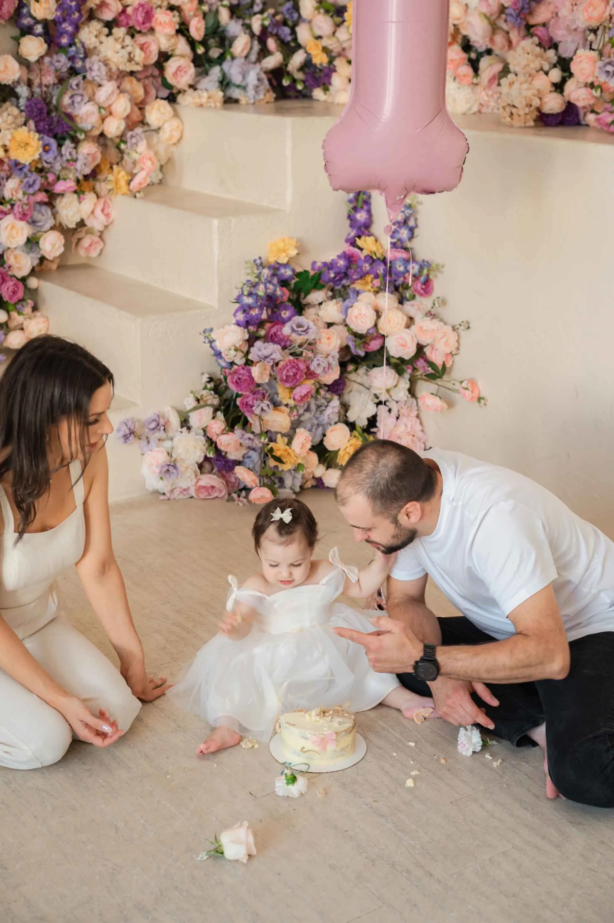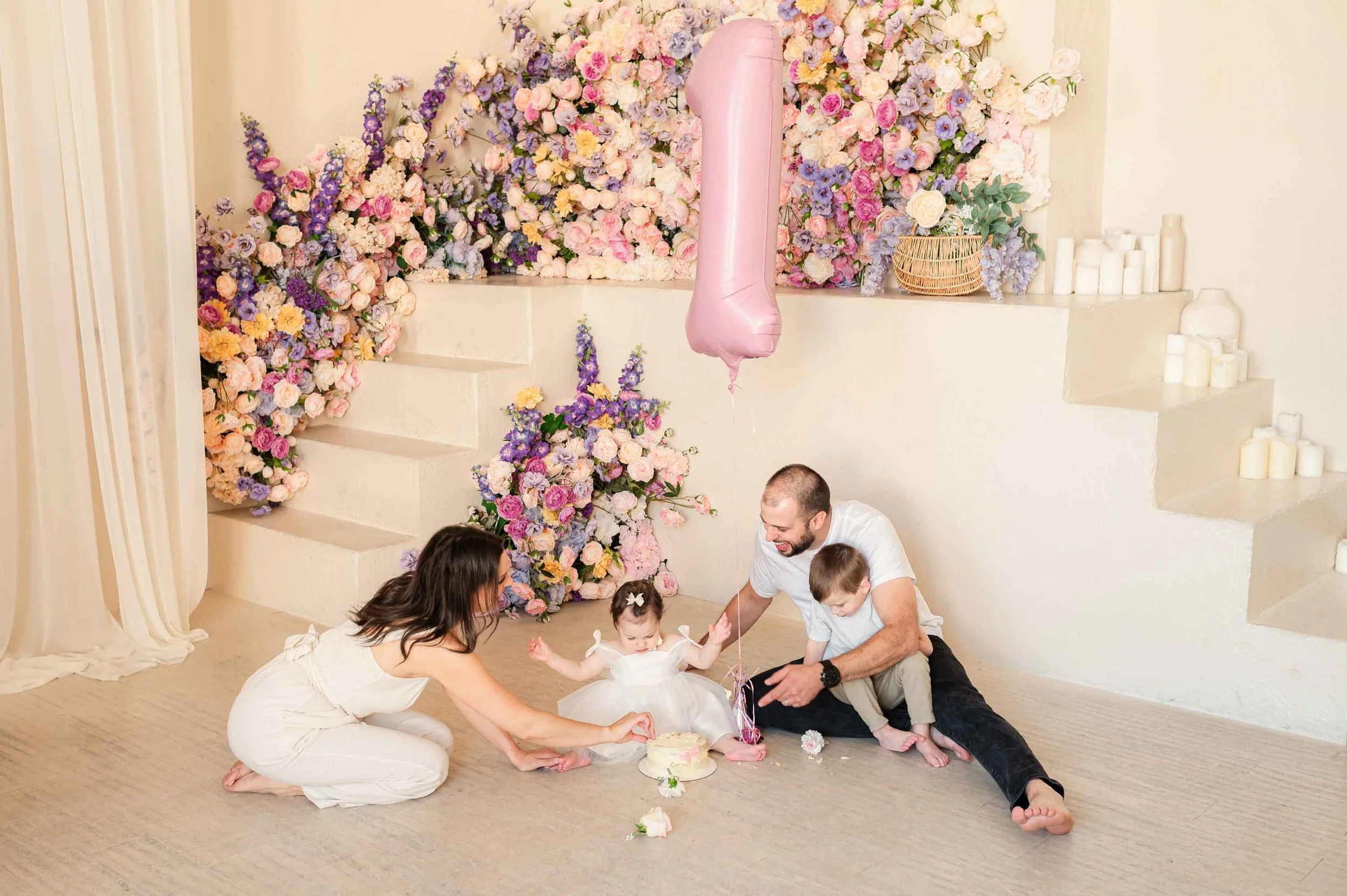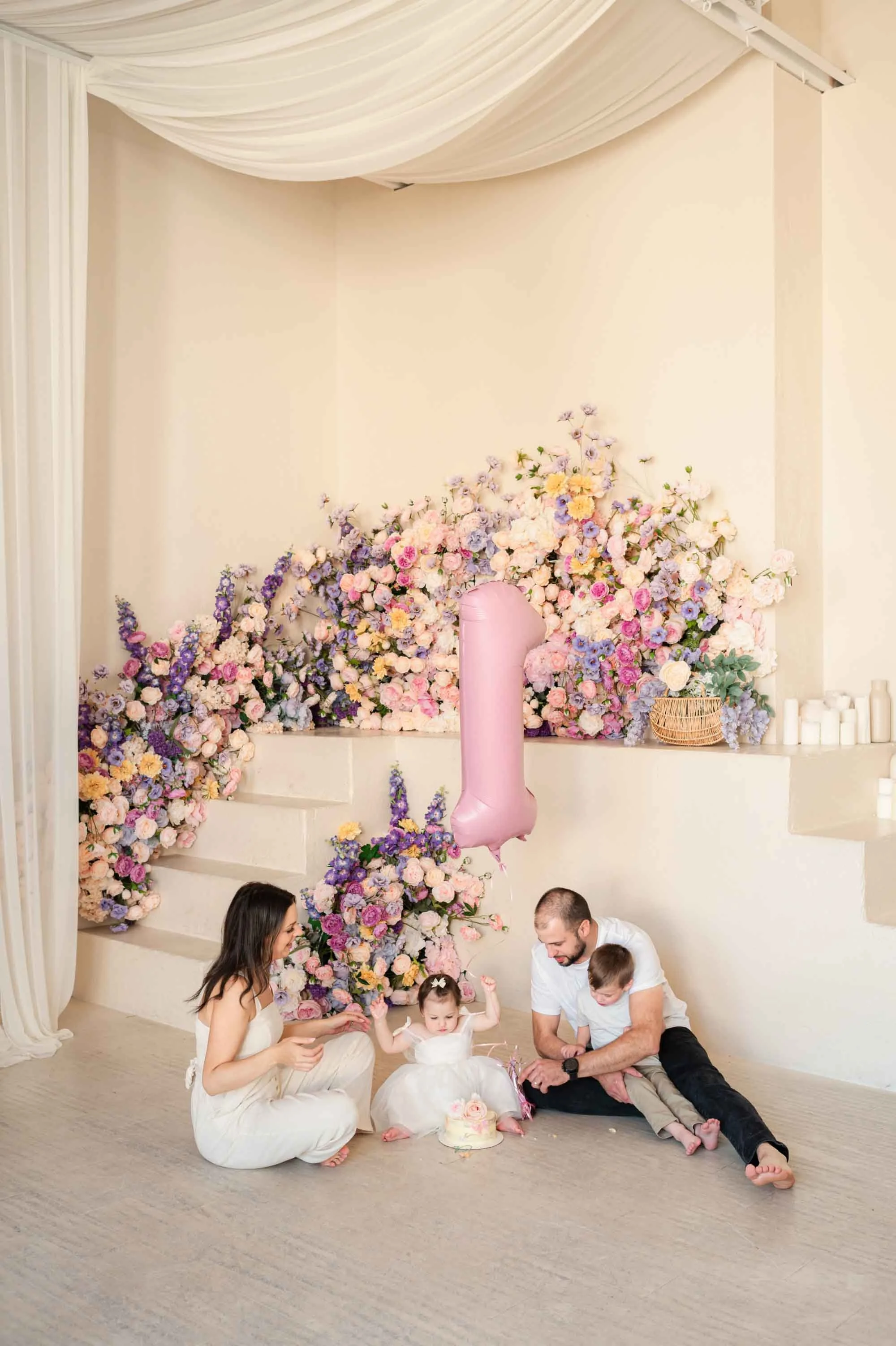 This session took place at Mint Room Studio’s iconic Lounge, which had been beautifully decorated with soft pink and purple florals. The setup was dreamy—equal parts modern and whimsical—creating the perfect backdrop for a luxe first birthday celebration. The florals added just the right amount of charm and colour, making every image feel vibrant, feminine, and full of joy.