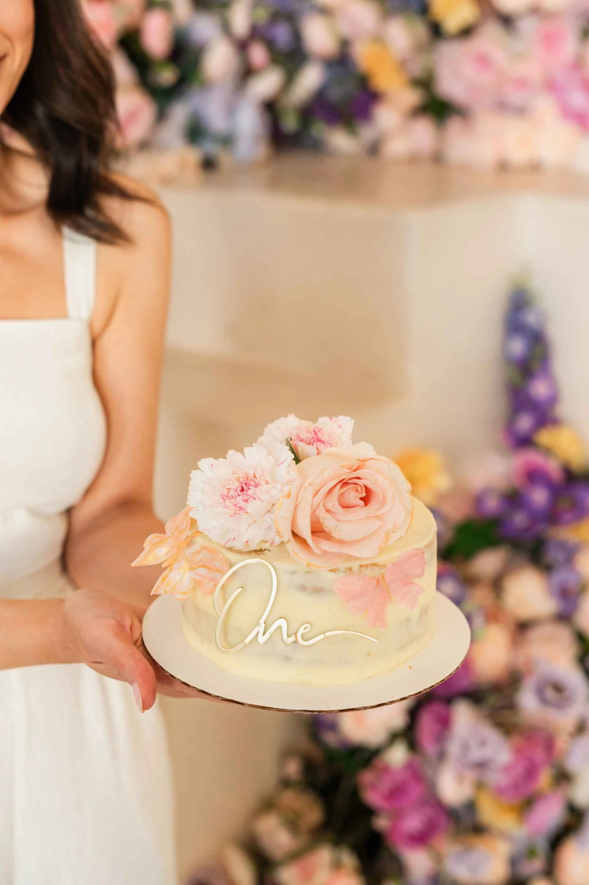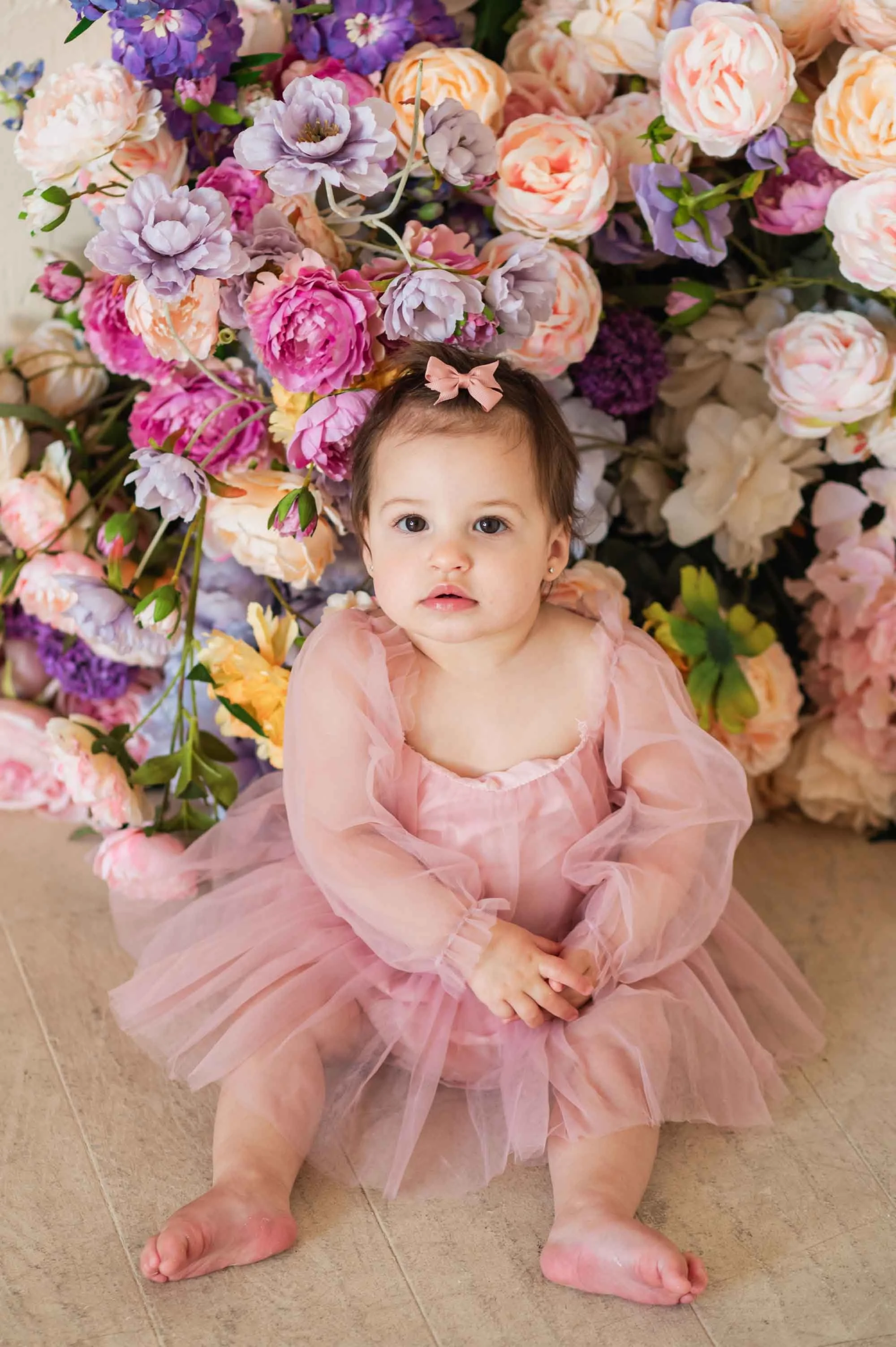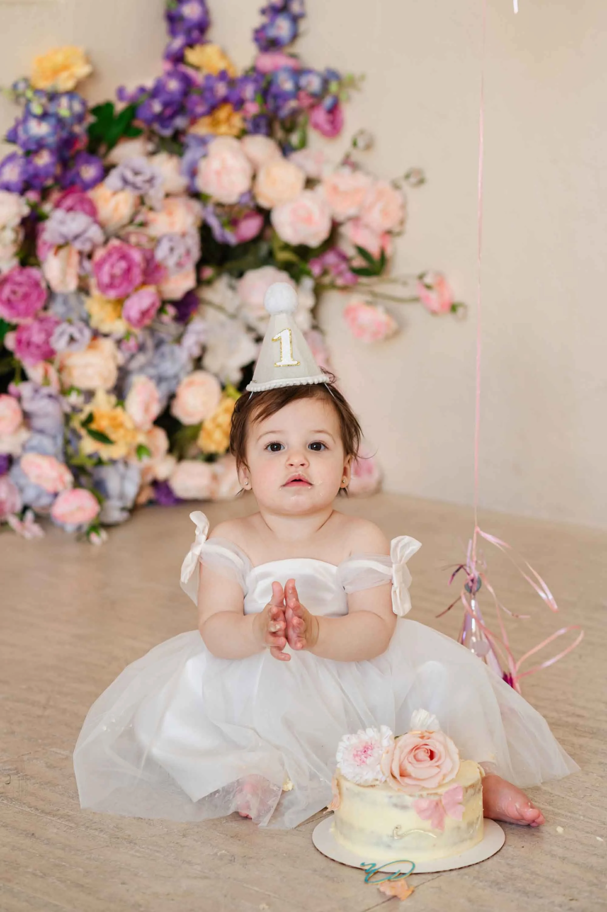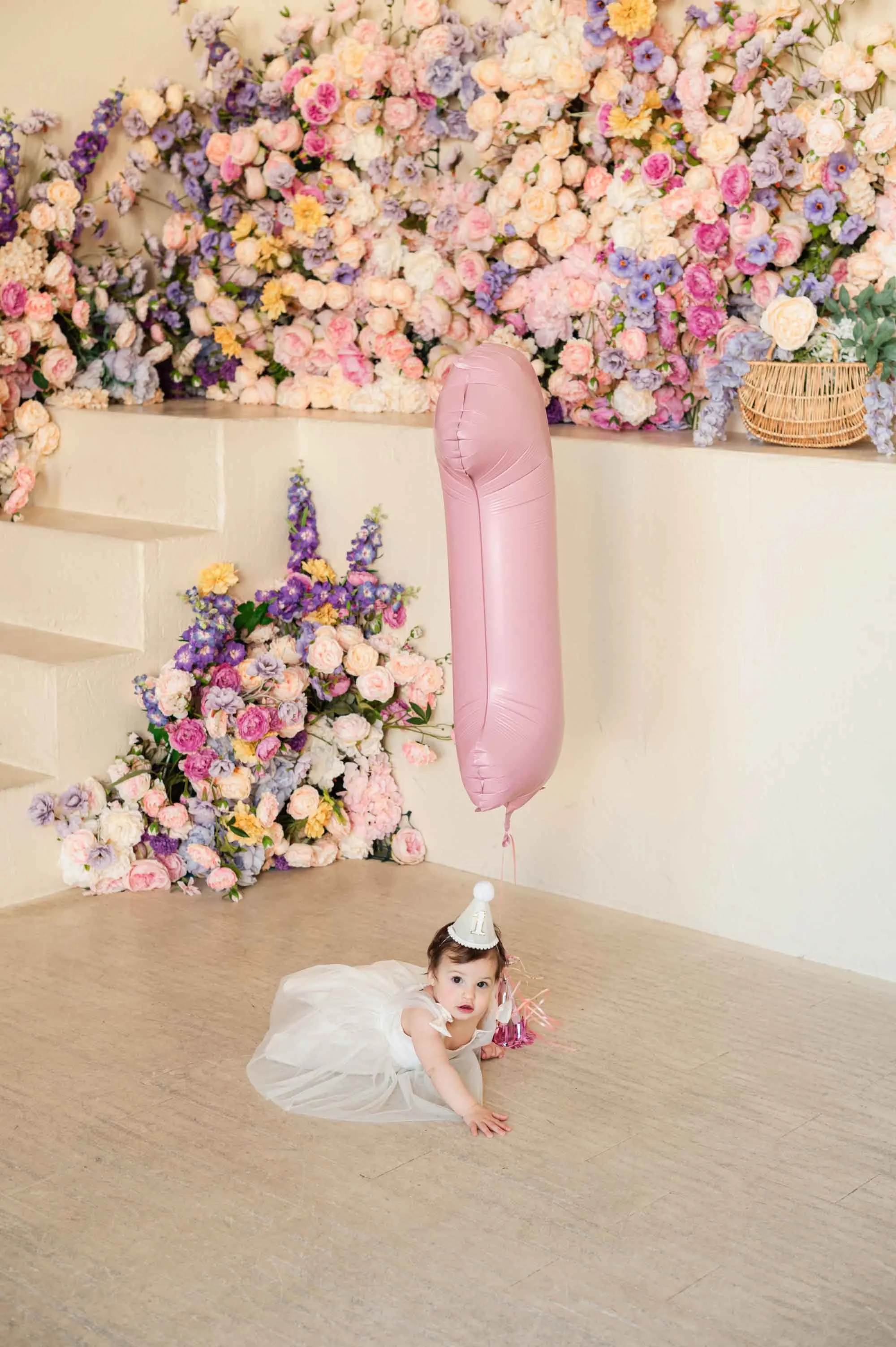 This session took place at Mint Room Studio’s iconic Lounge, which had been beautifully decorated with soft pink and purple florals. The setup was dreamy—equal parts modern and whimsical—creating the perfect backdrop for a luxe first birthday celebration. The florals added just the right amount of charm and colour, making every image feel vibrant, feminine, and full of joy.