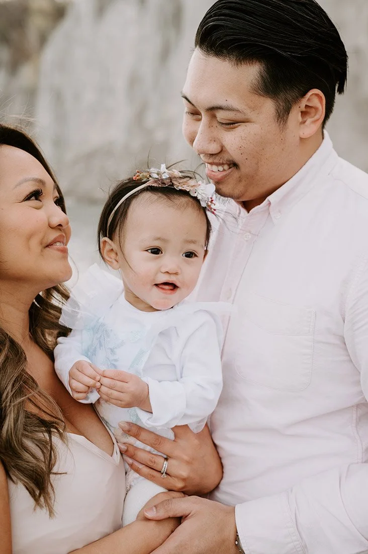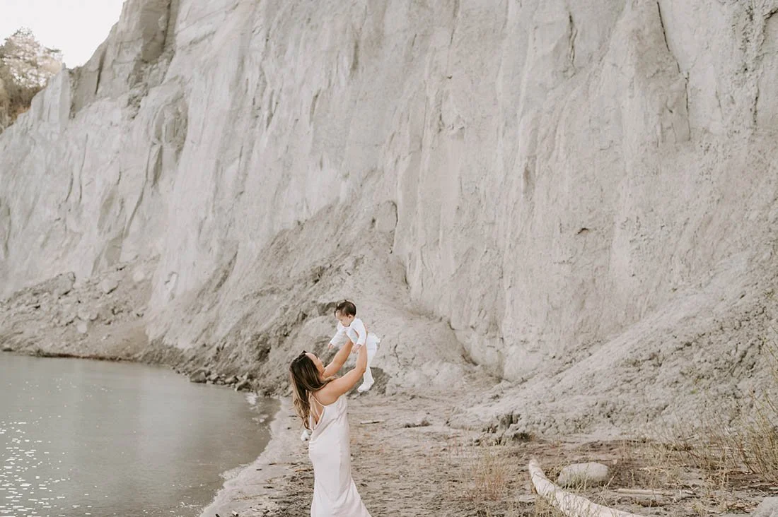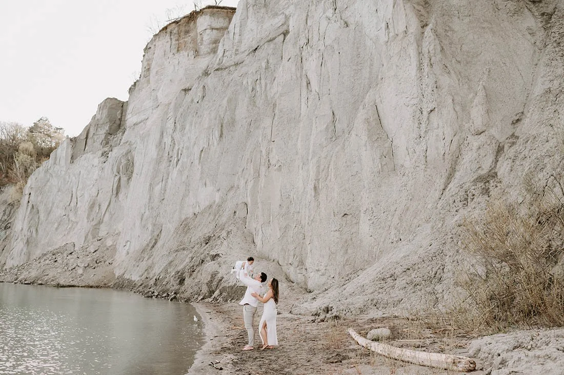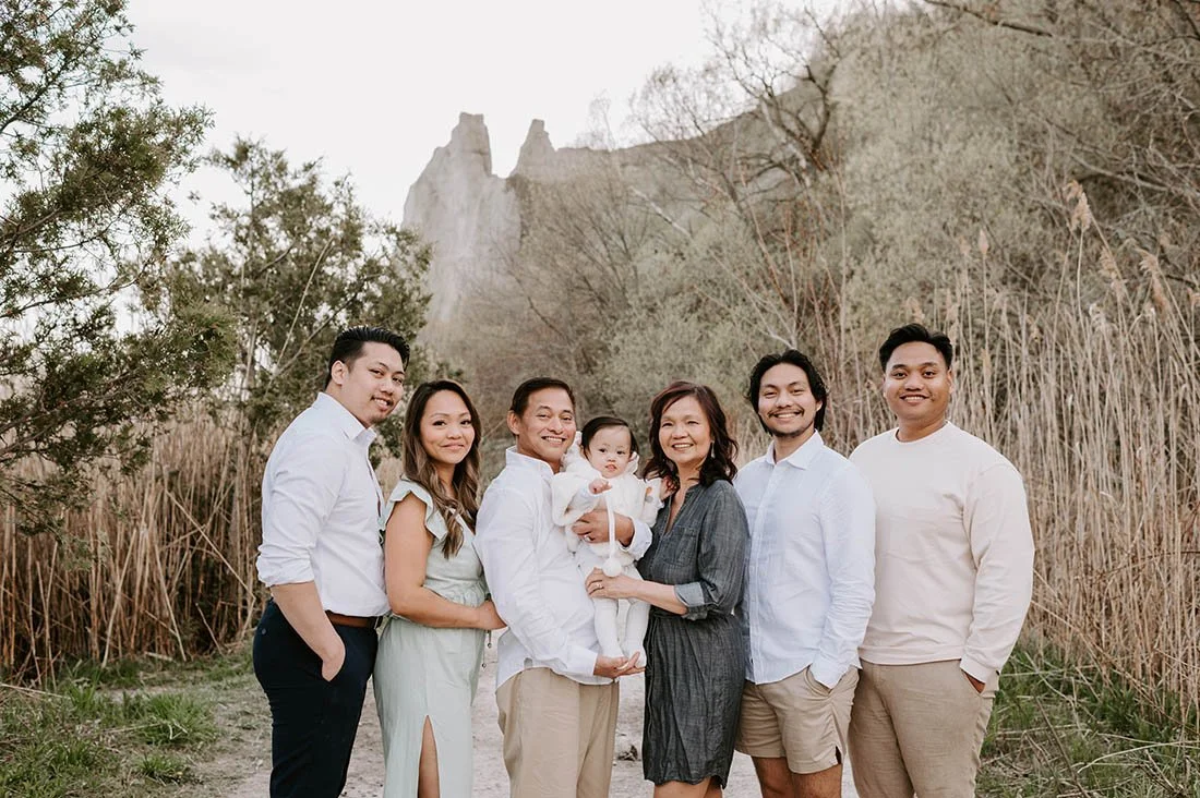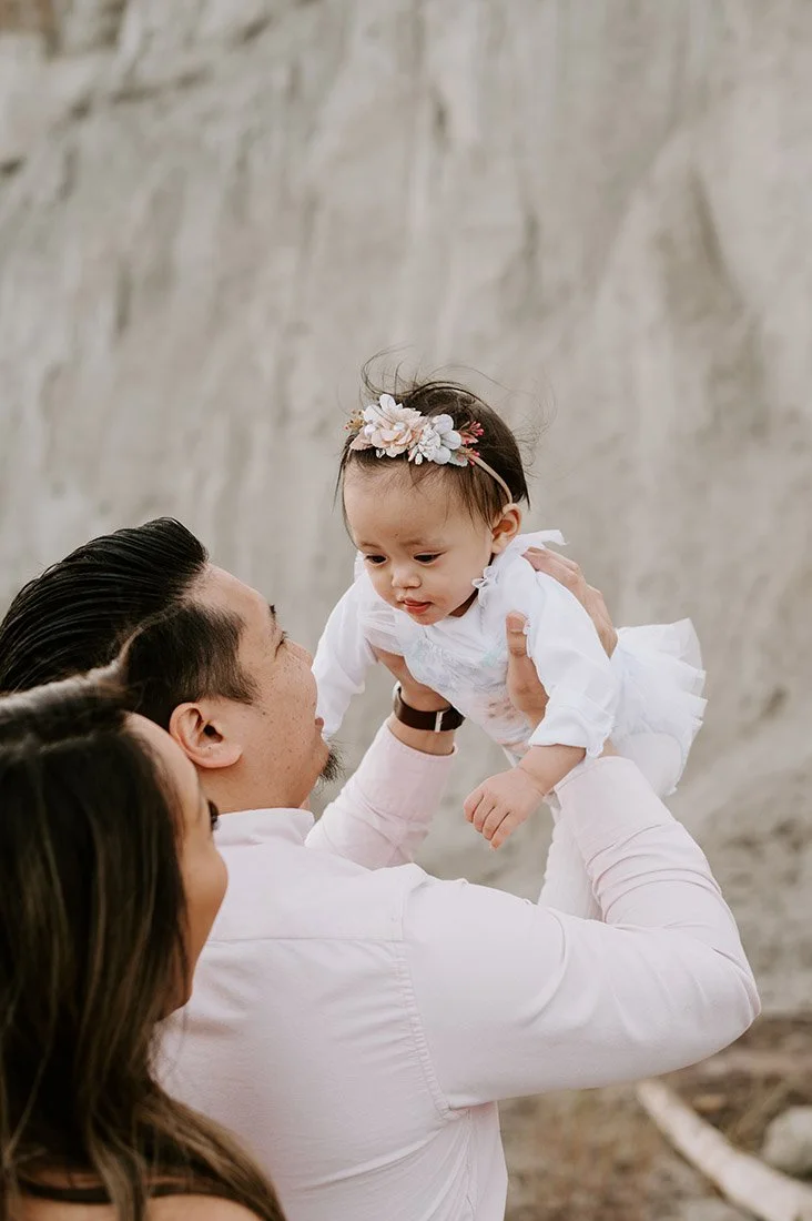 The family’s choice of a classic palette of whites and creams was absolutely timeless. Coordinated outfits like these bring a sense of elegance and cohesion to a gallery while still feeling natural and effortless. Against the textured cliffs and soft tones of the landscape, the neutral clothing allowed the focus to stay where it truly belongs—on the people, their love, and the genuine connections between them.
