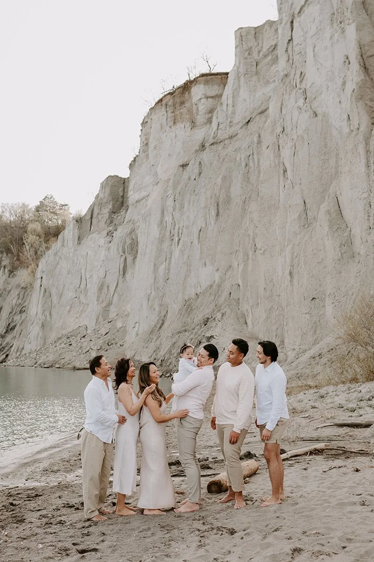 Celebrating a baby’s first birthday is one of those milestones that families always remember, and this returning family made it even more meaningful by including grandparents, aunts, and uncles in their session. It was such a joy to join them at the breathtaking Scarborough Bluffs, a location that never fails to impress with its sweeping views of Lake Ontario, dramatic cliffs, and lush greenery. The natural beauty of the bluffs paired with the golden light of the day created the perfect backdrop for this heartfelt celebration.