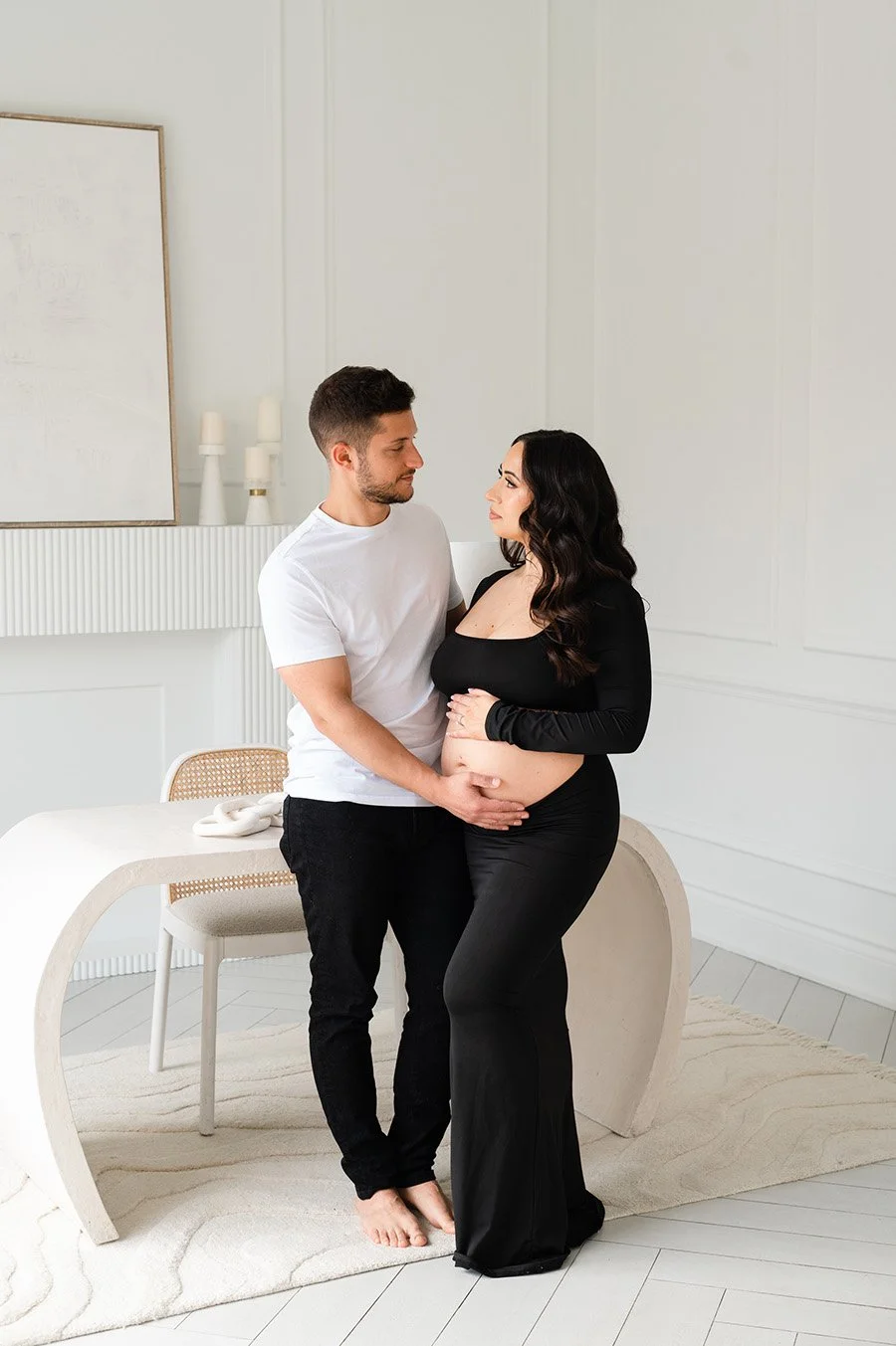 Studio maternity sessions provide a controlled setting with professional lighting and carefully designed spaces. This allows for creative styling, dramatic lighting, and a variety of looks, from minimal and elegant to bold and artistic. Studio sessions are ideal for clients who want a polished, editorial feel while still maintaining intimacy and emotion in the images.