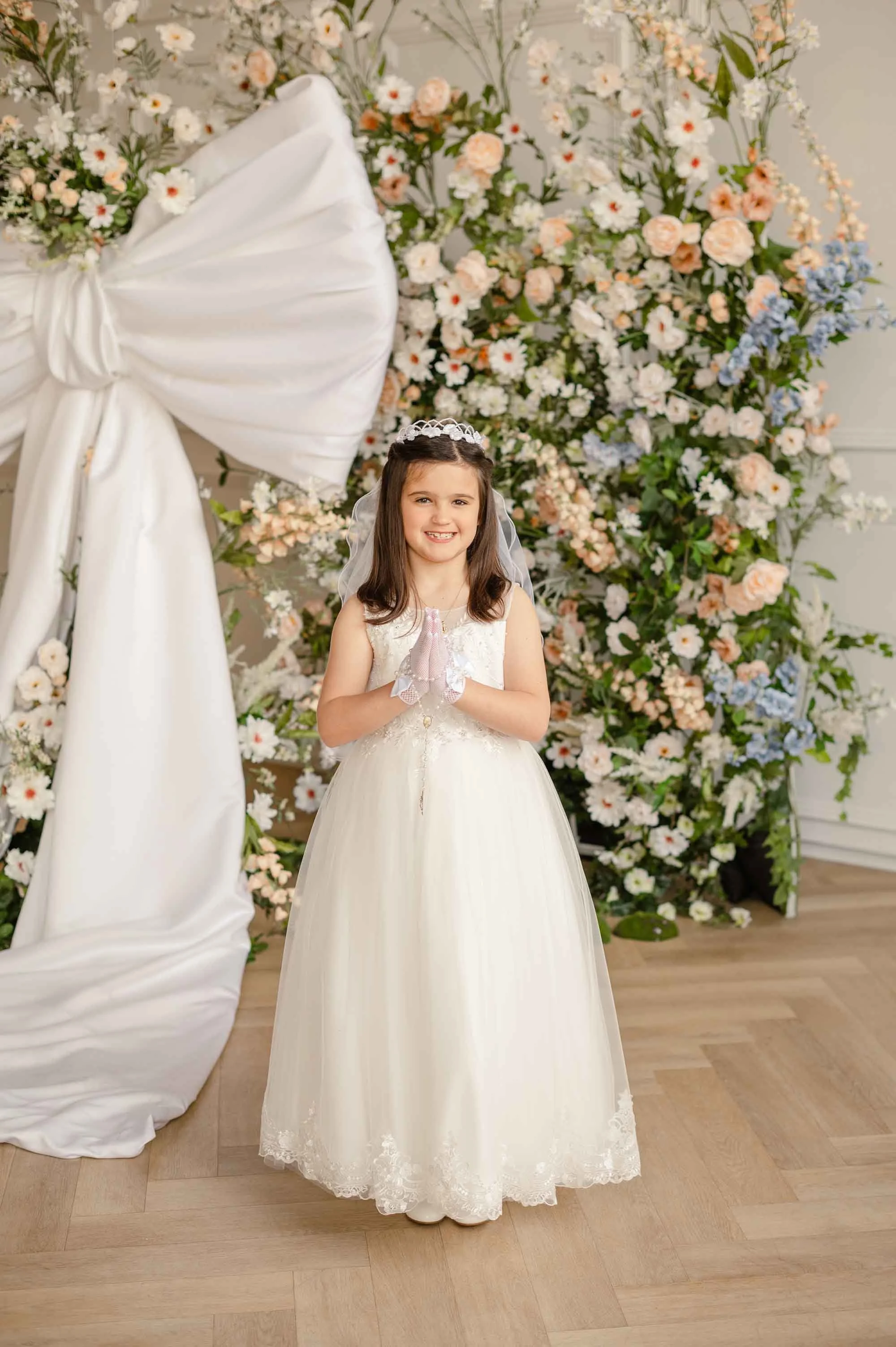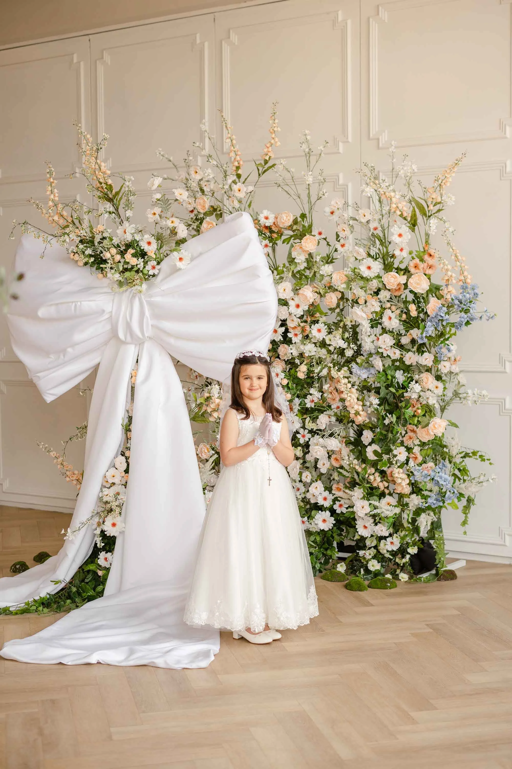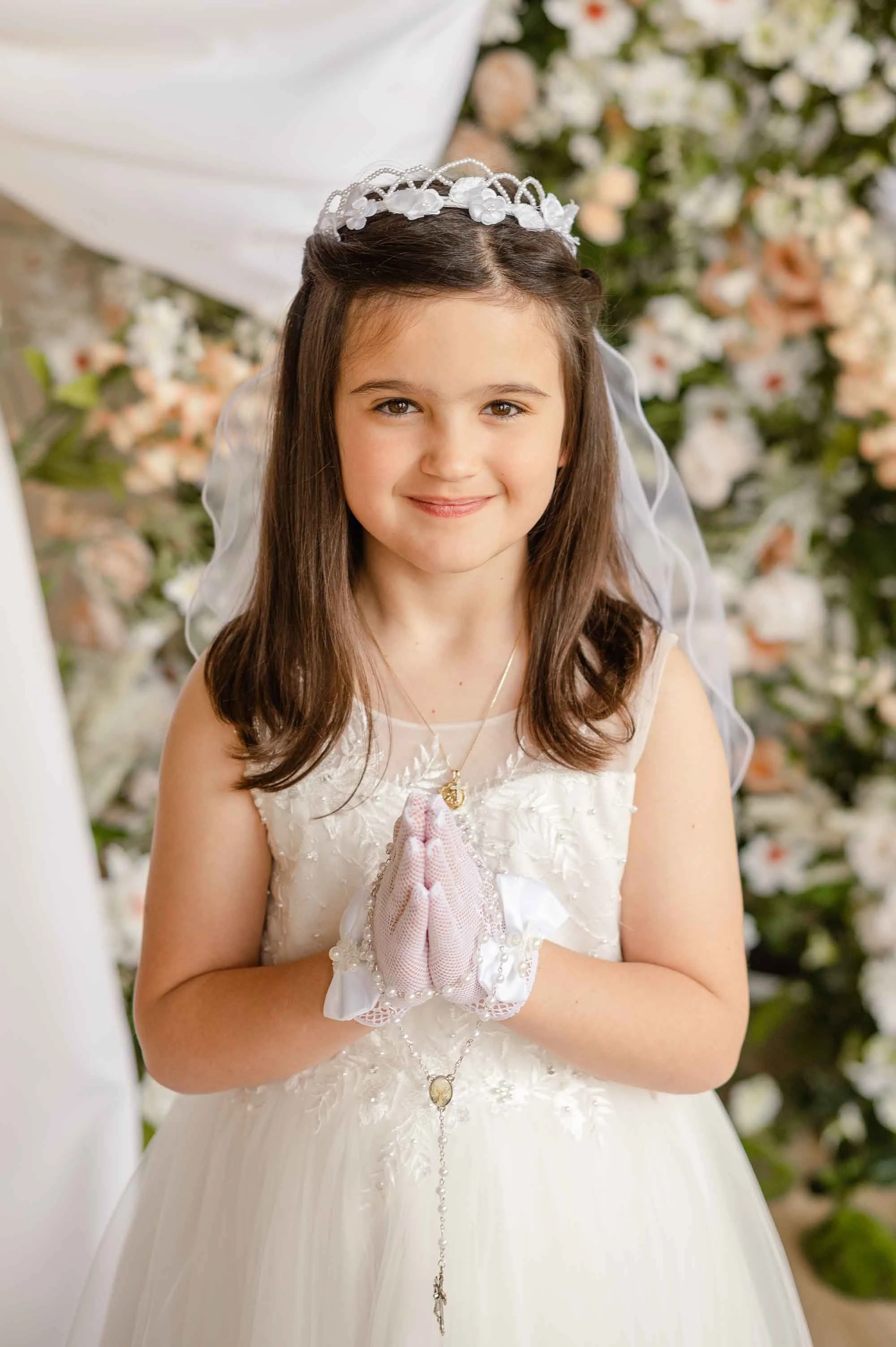 Photographing my own daughter’s first communion portraits was one of the sweetest and most meaningful experiences I have had as both a photographer and a mama. I wanted her to feel completely relaxed and able to enjoy every part of her special celebration, so we decided to photograph her portraits on a separate date from the ceremony. This allowed us to keep the actual communion day focused on the moment itself without any pressure or rush to fit in photos. It was the best decision. We were able TO be present and enjoy every second of her milestone.