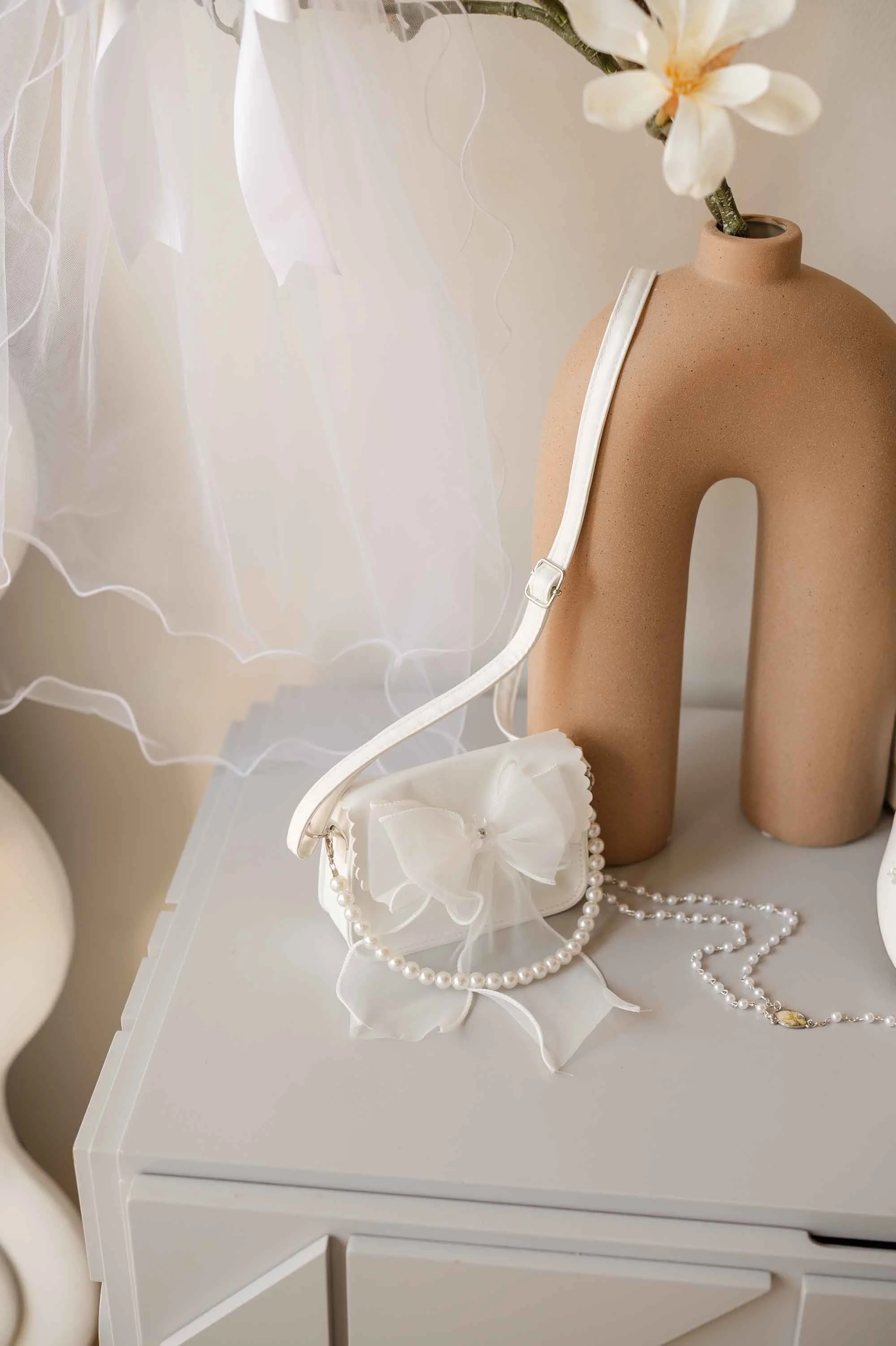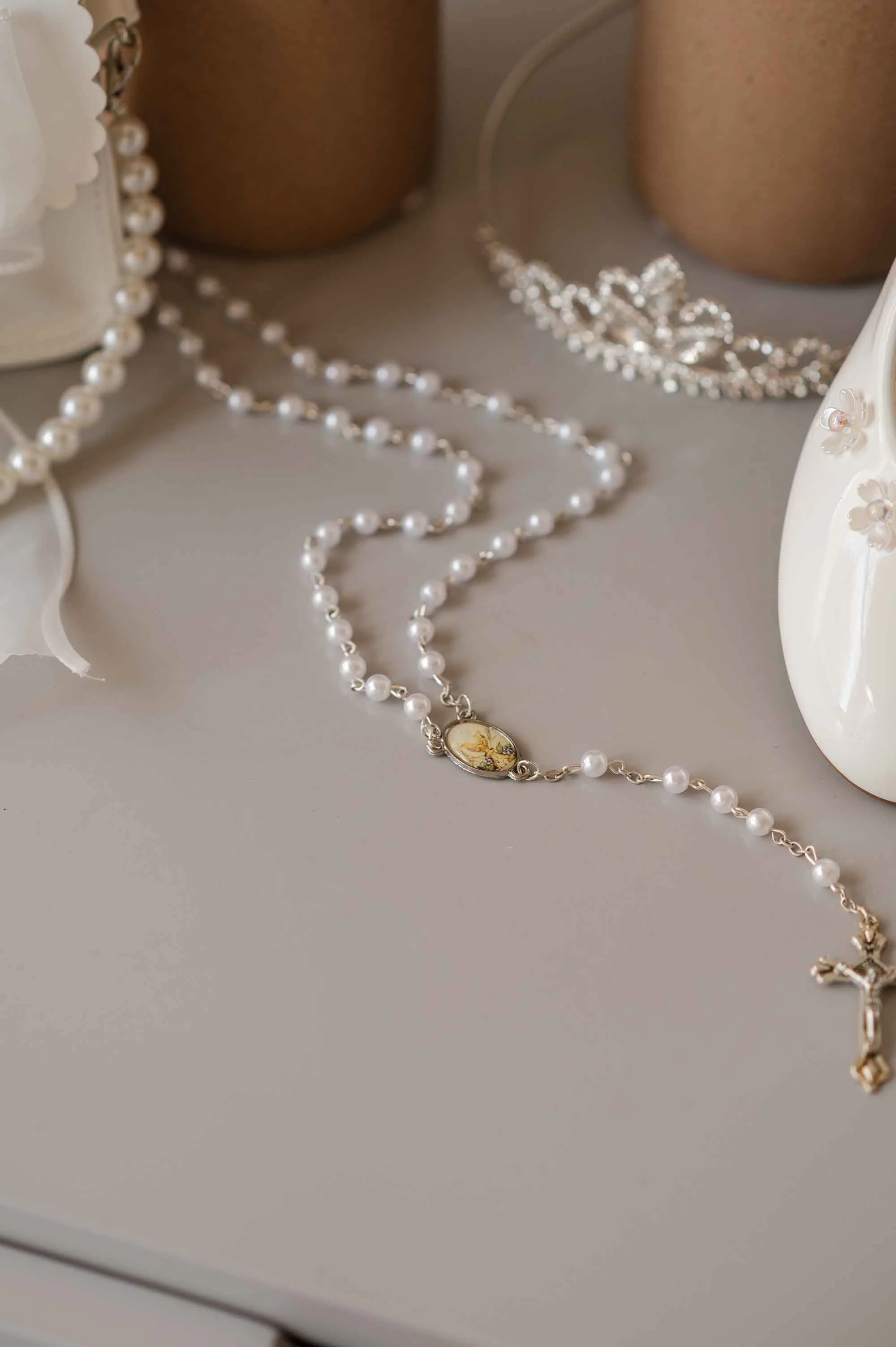 For her portrait session, we chose Preto Loft in the West Side Studio, a space I adore for its soft light and warm atmosphere. It was the perfect setting to capture all of her delicate details. Before photographing her portraits, I spent time documenting the special pieces she would wear for her ceremony. Her dress, veil, rosary, gloves, purse, shoes, and jewelry were all carefully arranged and photographed so that every meaningful element could be remembered. Each piece held sentimental value, and capturing them felt like preserving tiny pieces of her story.
