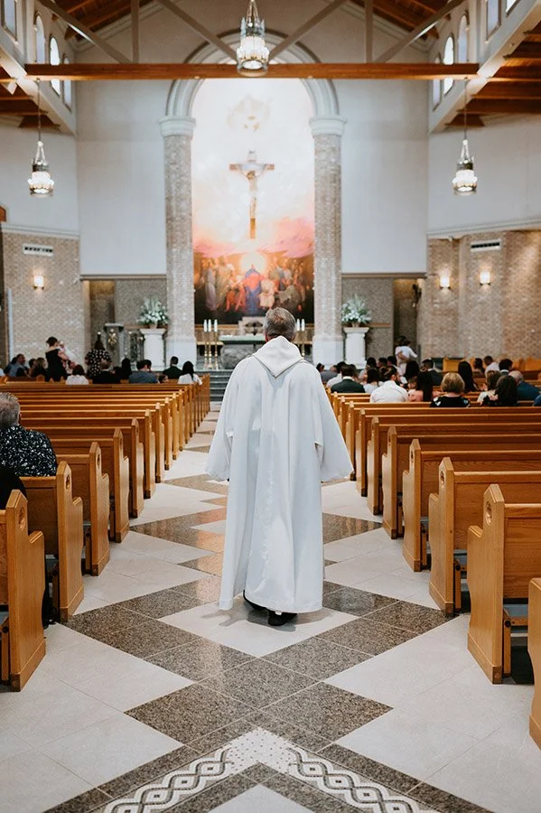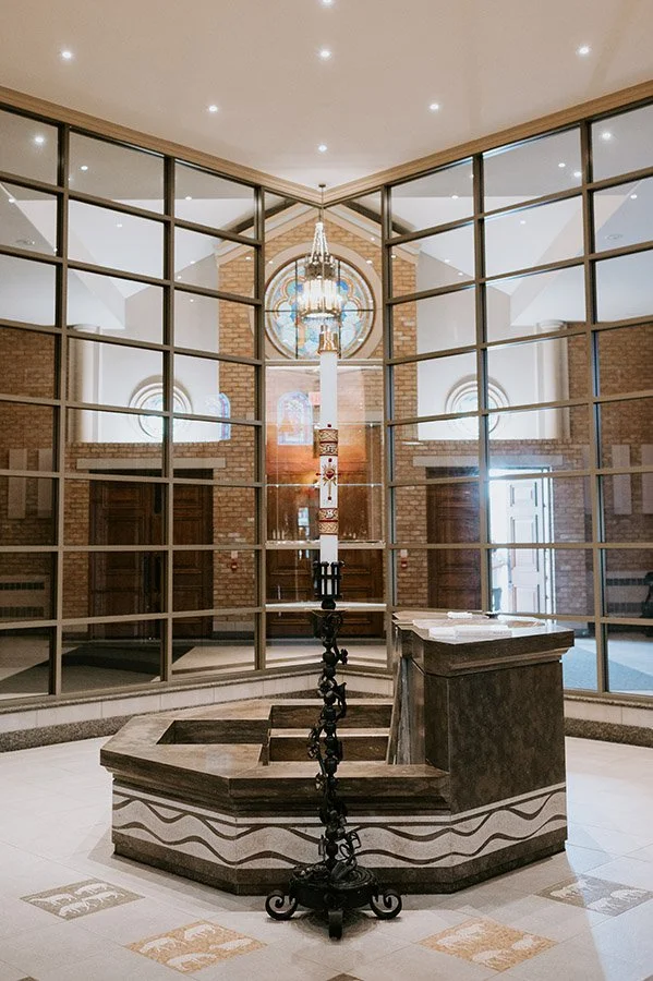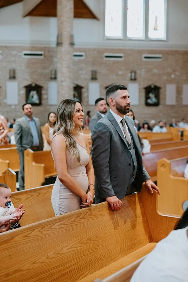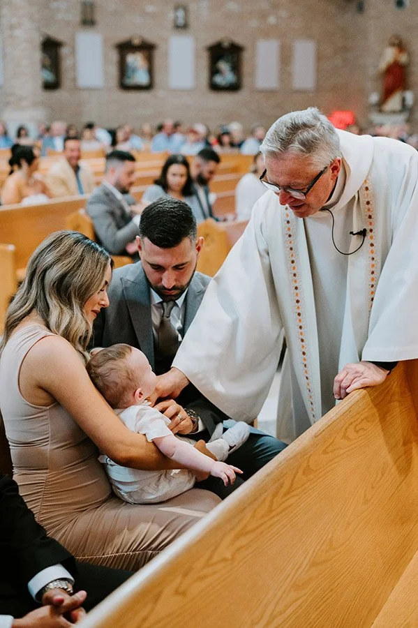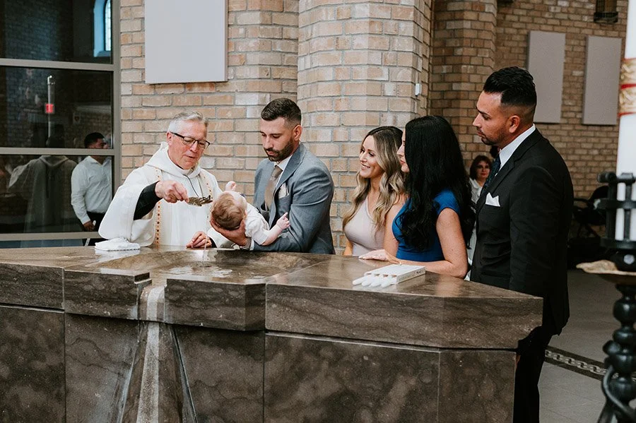 The ceremony was held at St. Clare of Assisi Church in Woodbridge, a stunning space filled with natural light and a strong sense of community. The baptism itself was beautiful and heartfelt, with the priest blessing the baby boy while his family looked on with pride and joy. I made sure to capture every part of the ceremony, from the blessing of the water to the tender glances exchanged between parents and godparents.