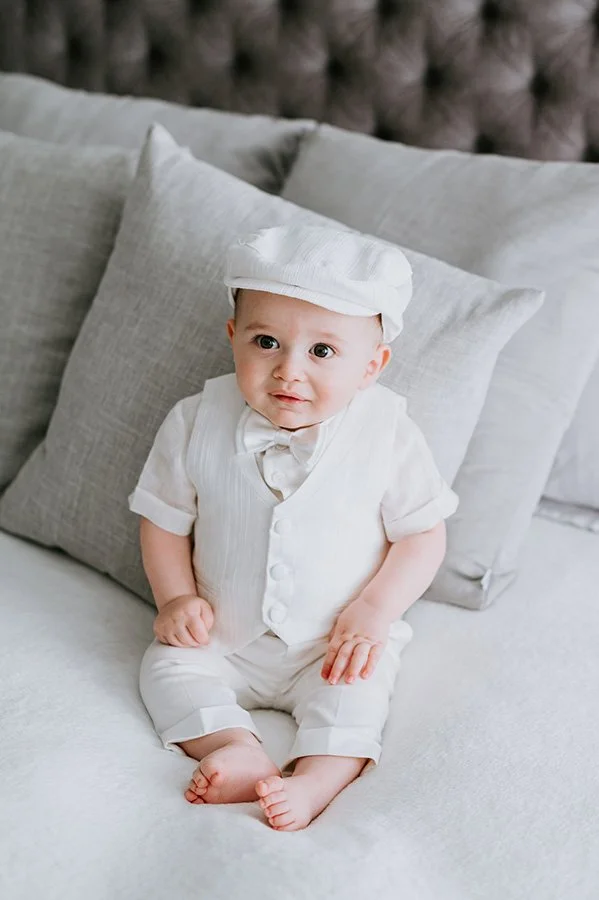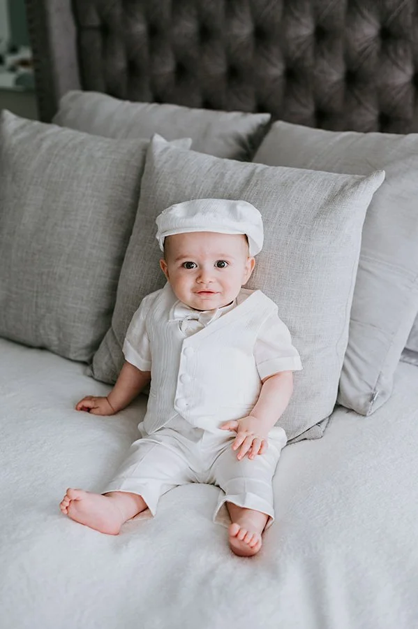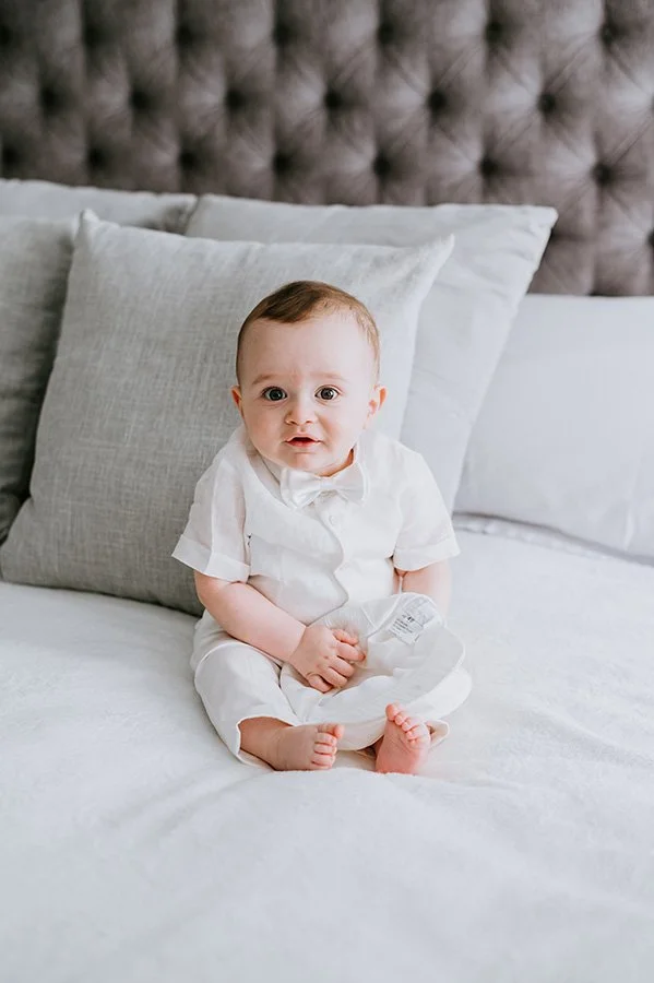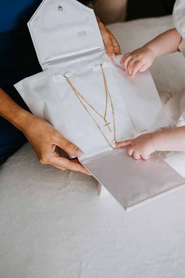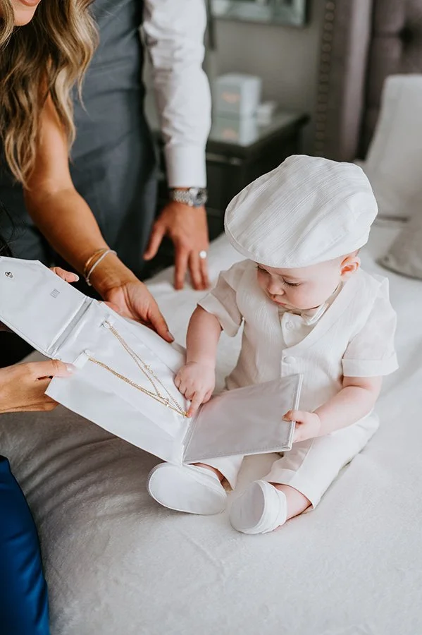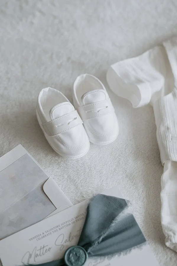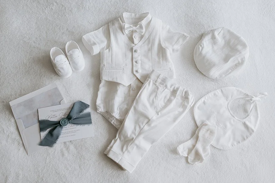 There is something so special about a baptism day, and this one was no exception. This sweet baby boy, the second son in his family, was surrounded by love as his parents, older brother, godparents, and extended family gathered to celebrate his sacrament. The day began at home, where the excitement was tangible as everyone prepared for the ceremony. I always enjoy starting a baptism session with the little details, so I took time to photograph the invitation, the carefully chosen outfit, and other keepsakes that will hold meaning for years to come.