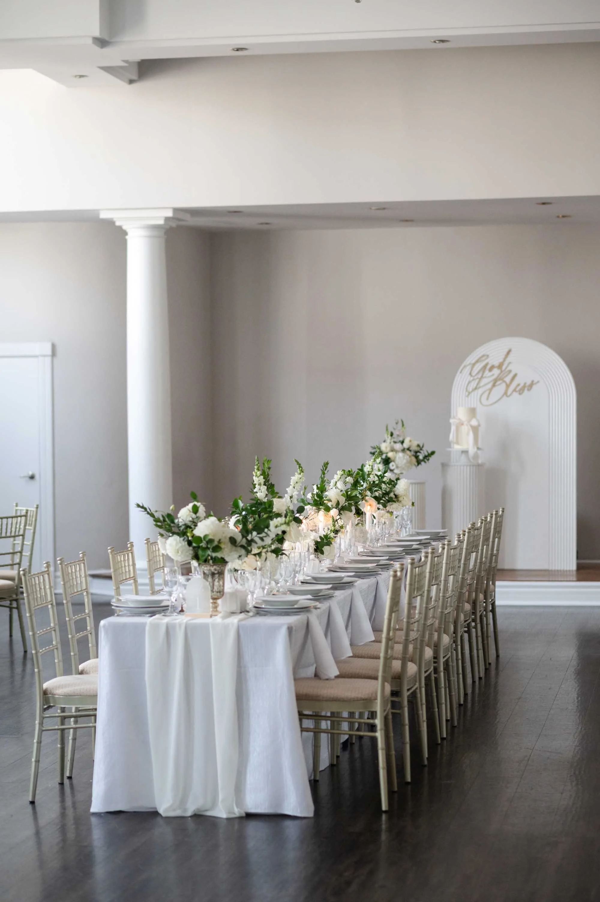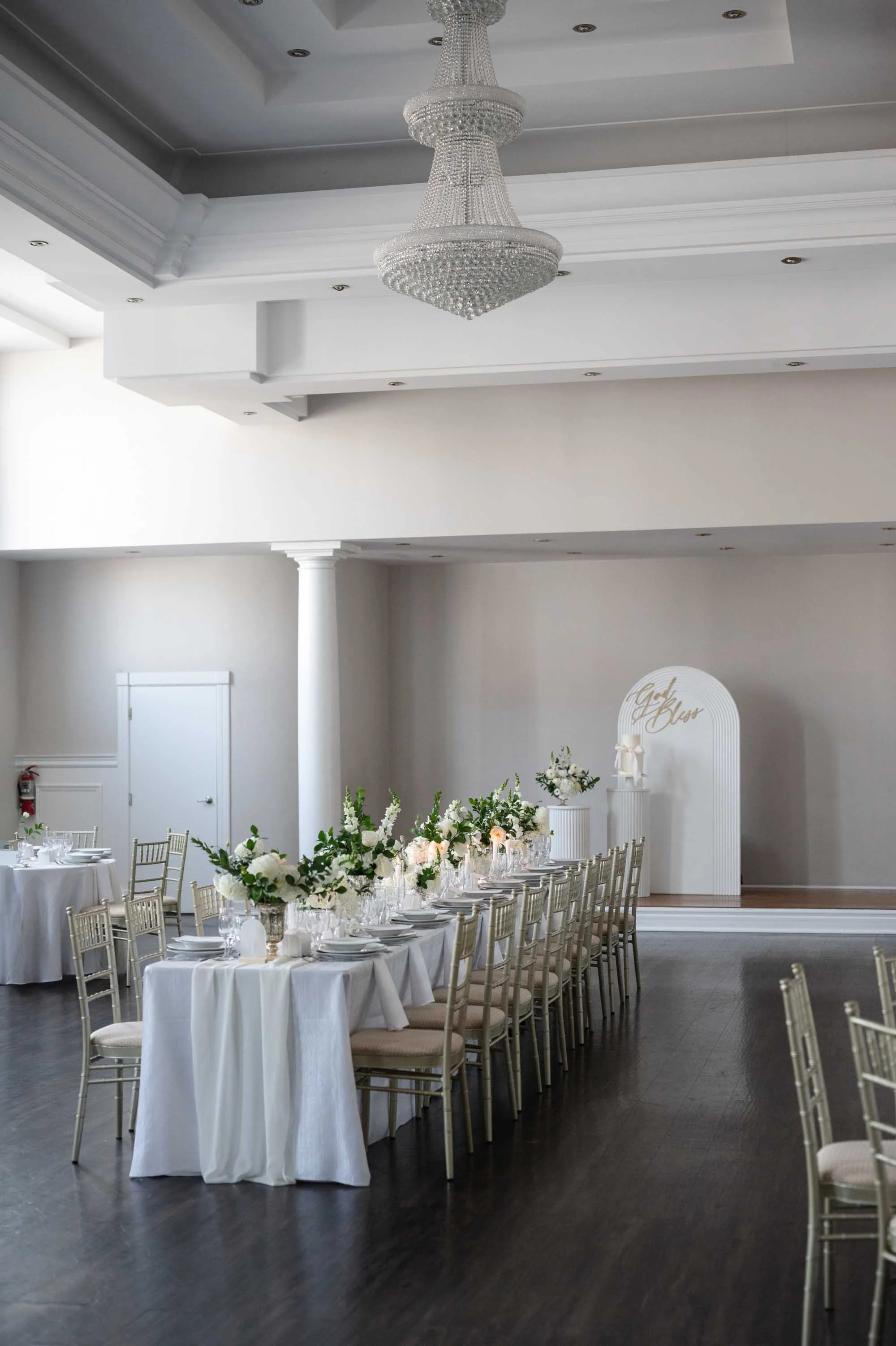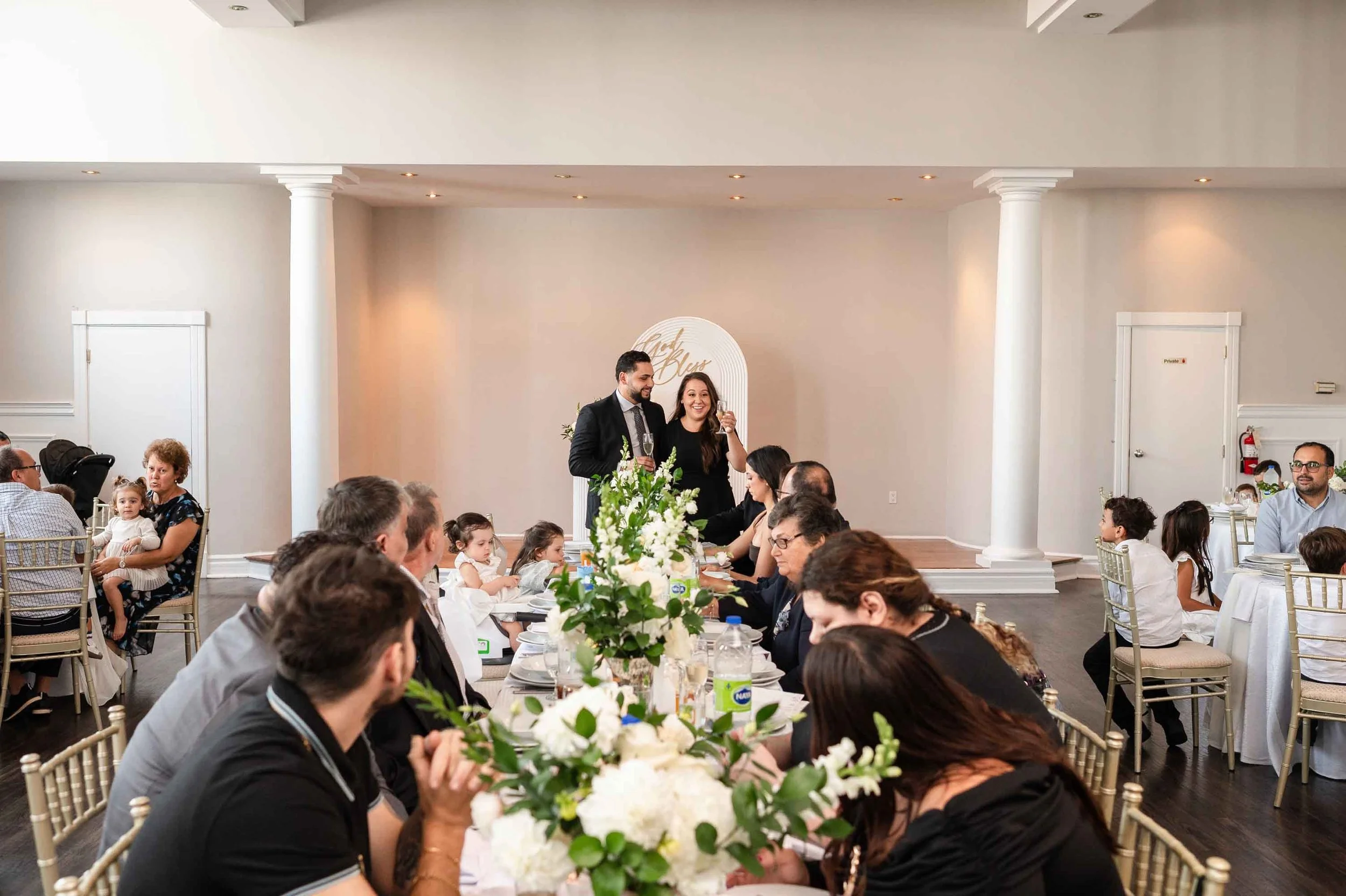 Following the church service, the celebration continued at Europa Convention Hall in Toronto, where the family hosted a beautiful reception. The space was decorated elegantly with white florals thoughtfully arranged by a close family friend. The floral arrangements brought a fresh, classic feel to the reception, adding softness and charm to every corner of the room.
